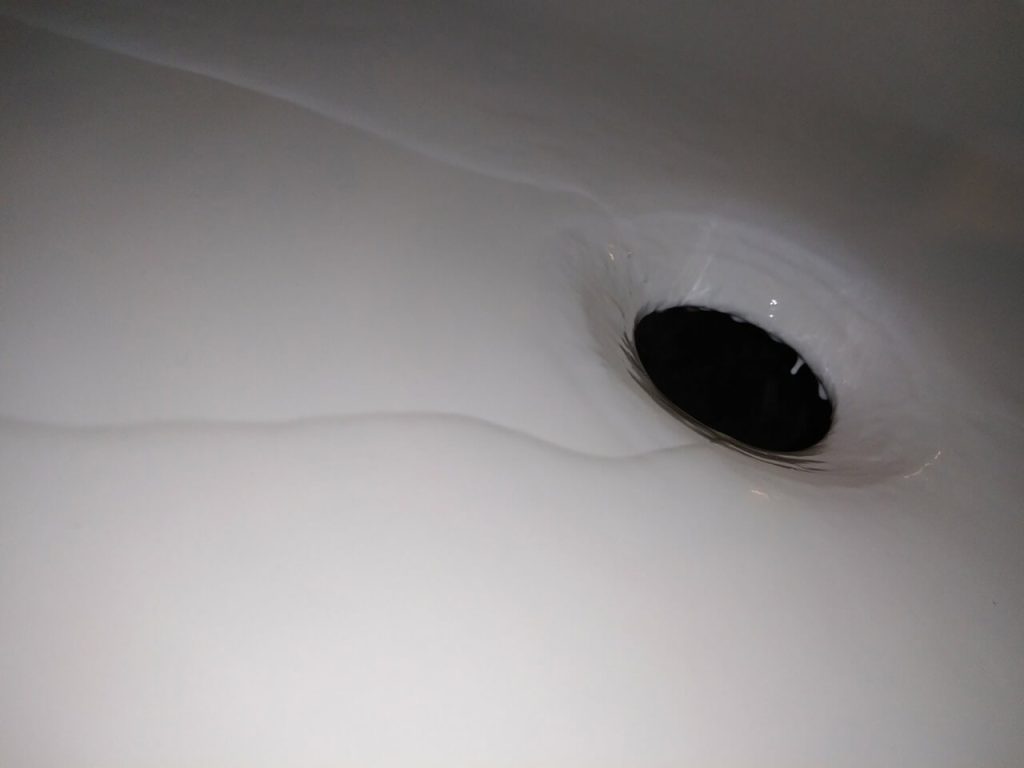 Такие реставрации ванн выполняются так же, как и обычная наливная ванна, но с «затыканием» сливного отверстия (как на фото выше) цилиндрическим предметом. Эта технология была названа восстановлением заливки «на стаканом», потому что простой пластиковый стаканчик действует, как закупоривающий предмет. Закрывая сливное отверстие, жидкий акрил скапливатся на дне ванны равномерном толстым слоем.